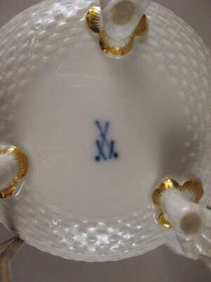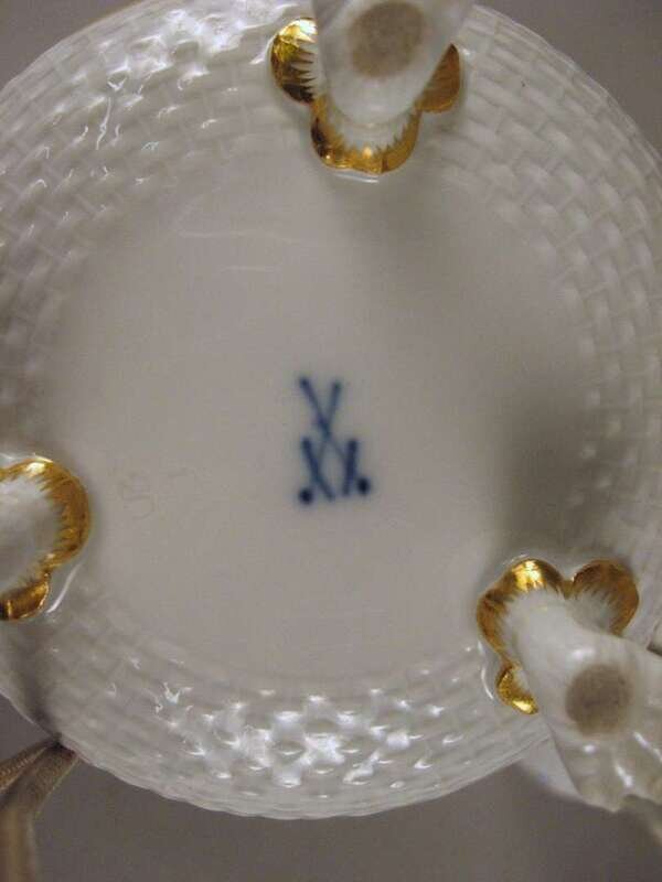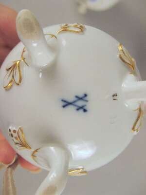 Comprising two small jugs with foliate sprays and a slightly larger example with a berried knop and foliate sprays on a basketweave ground, blue underglazed crossed sword marks. (3).
