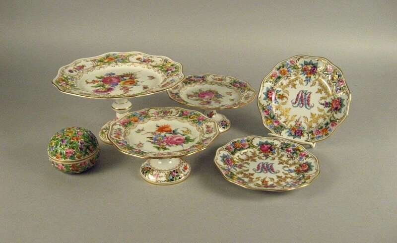 Comprising three cake plates, two dessert plates and a covered box with pierced floral decoration, all decorated with foliate decoration and gilt accents. (6).