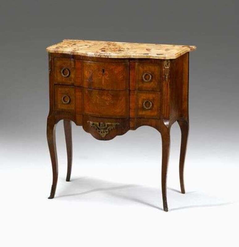 Transitional style gilt bronze mounted marquetry, walnut and tulipwood commode