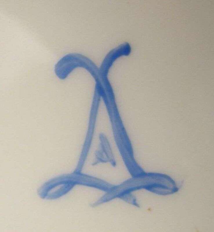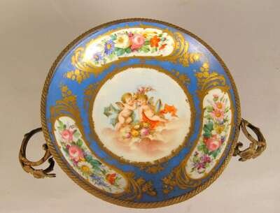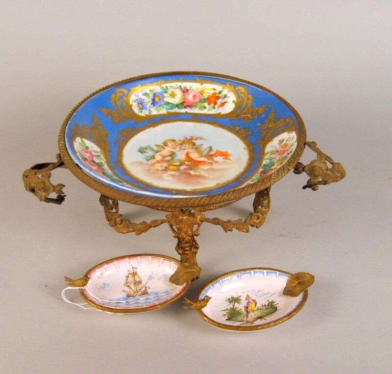 With a bleu celeste ground and painted floral reserves centered by a painted reserve of two cherubs supported on a gilt metal stand cast with swags and foliage; together with two low french porcelain gilt metal mounted ring dishes. (3).