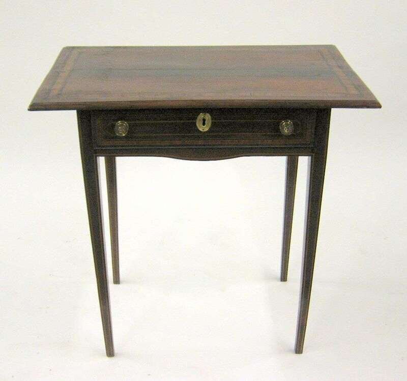 The molded rectangular top over single drawer resting on slender tapering legs.