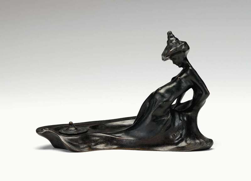 Bronze, brown patina, modeled as a nude female figure with a peaked hat, seated beside an inkwell.