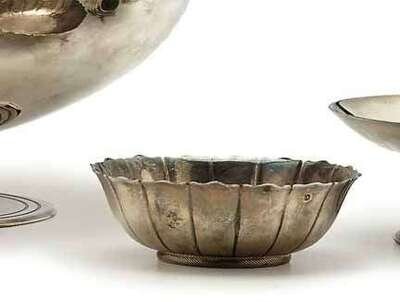 Of shallow circular form with facetted sides and a scalloped rim, stamped Puiforcat, paris; together with a circular puiforcat silver plate compote raised on a malachite type stand. (2).
