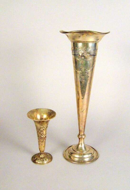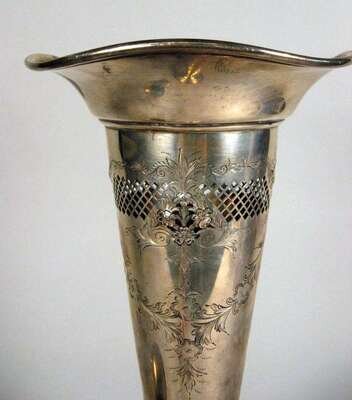 Of tapering trumpet form on a domed circular foot, with pierced and chased floral decoration; together with a small Kirk & Sons bud vase with repousse decoration of flowers and c-scrolls. (2).