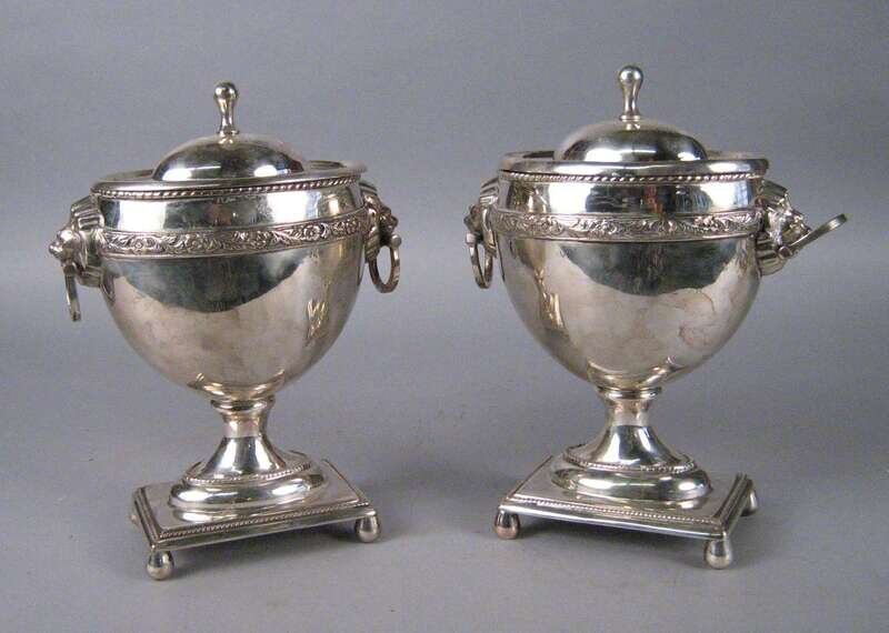 Pair of silver plate urn form lidded tureens 20th century