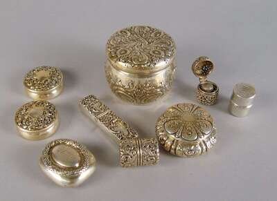 Comprising a dressing table jar by J.F. Fradley Co., pair of Gorham pill boxes, small box retailed by J.E. Caldwell & Co., small hinged pill box, needle case, thimble case by S. Cottle & Co., and an Unger Brother thimble & thimble case; all with repousse foliate decoration; together with a plain sterling thimble case. (9).