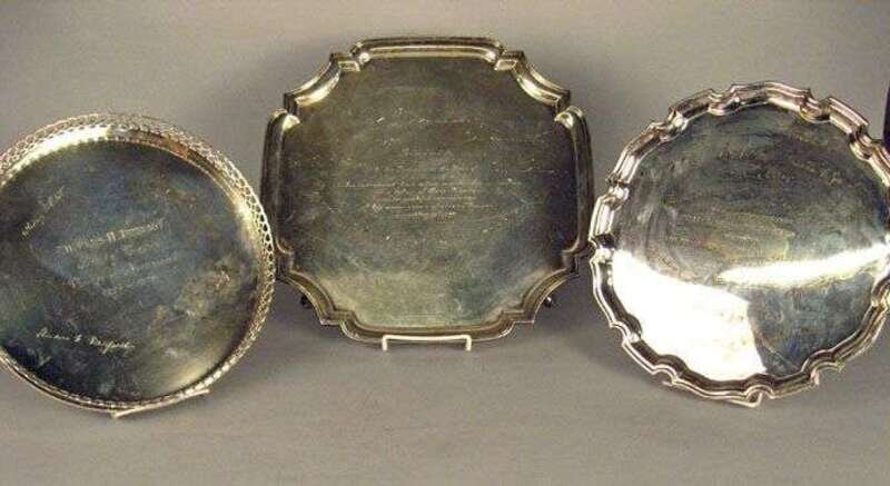 Comprising two English sterling silver salvers and a Portuguese silver galleried tray, each inscribed. (3).