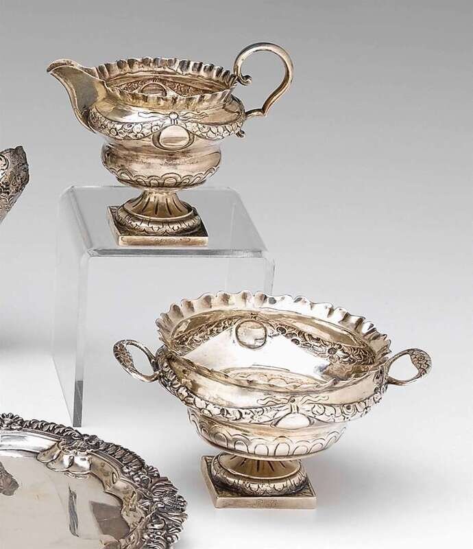 The open sugar bowl dated 1744, assay mark for Peter Nicolai von Haven, maker's mark unknown, the creamer with assay mark for Christian F. Heise, maker's mark L. Berth, both with floral swag repousse decoration and wavy rims, raised on squared bases with stippled initials to side. (2).
