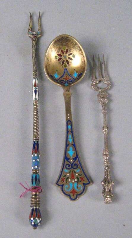 The first example a champleve and plique-a-jour silver gilt spoon, the other a cloisonne enamel pickle fork, both stamped 84 standard; together with a unmarked silver fork with a gargoyle finial. (3).