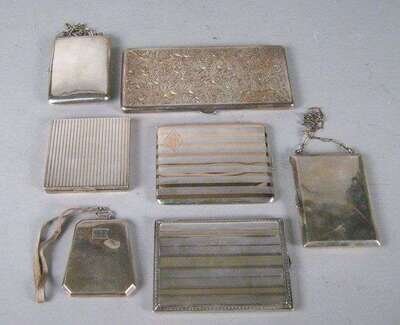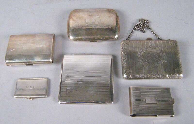Comprising a square card case by the Eastern Sterling Company, small vesta case by the Napier Company, small card case, marks rubbed, hammered card case, marks rubbed, change purse on a chain, a rectangular change purse stamper R. Blackington & Co., change purse with foliate engravings by Battin Co., a very small Tiffany & Co. card case, a change purse by James E. Blake Co., large card case by International sterling and a large card case by James E. Blake Co.; together with a mexican silver handkerchief case and a compact stamped '925'. (13).