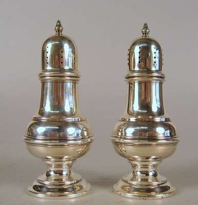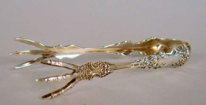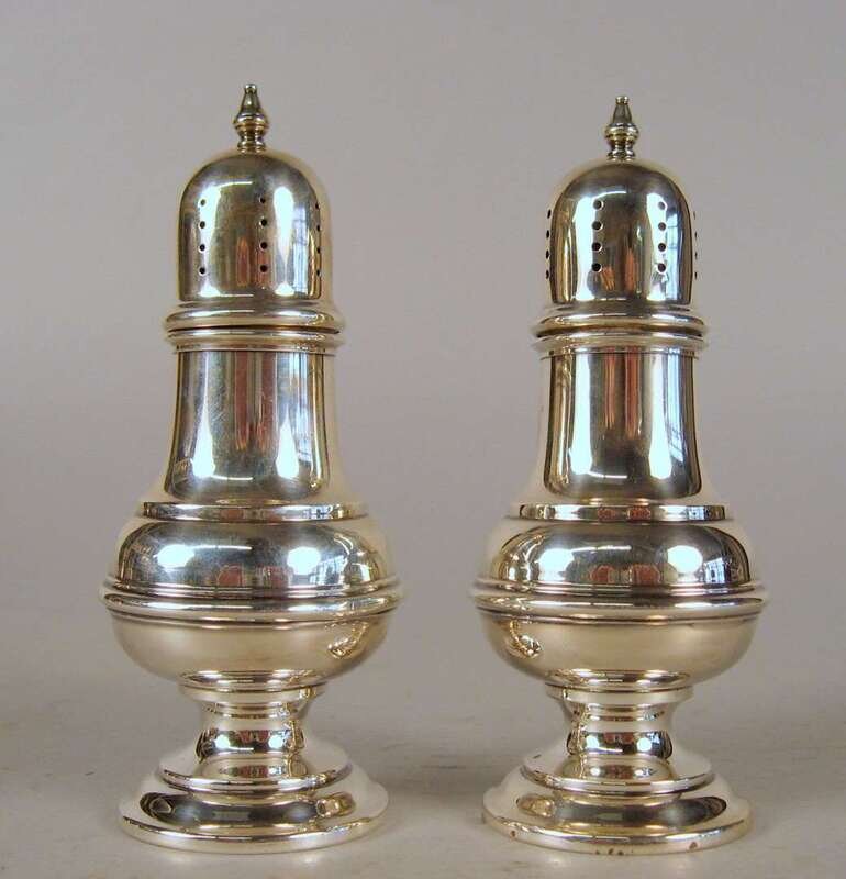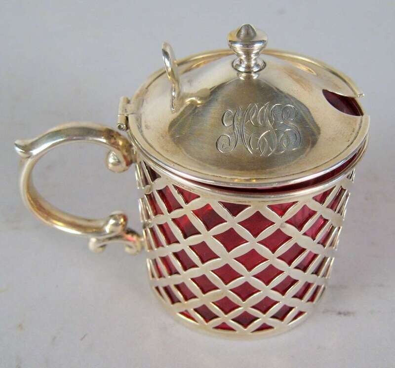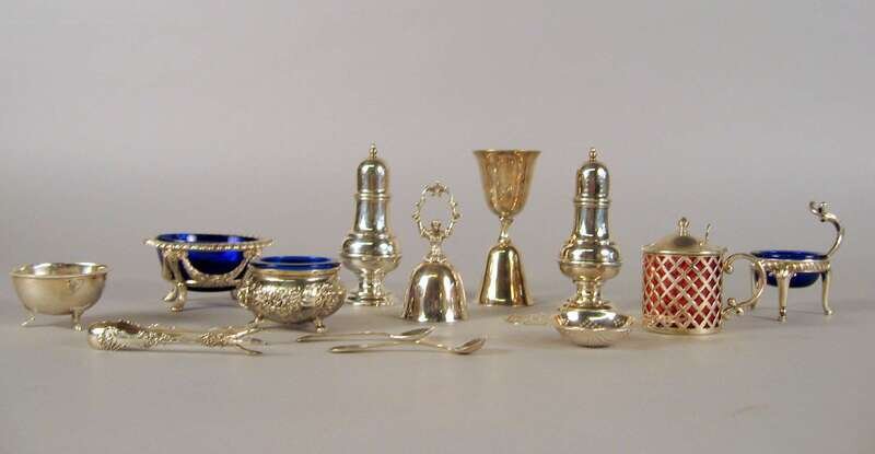 Comprising a mustard pot with red glass liner by Watson Co., pair of salt and pepper shakers, Reed & Barton measuring toddy, Whiting 'Pompadour' pattern sugar tongs and a Reed & Barton bell; together with a Dutch silver tea strainer, with date marks for 1921 and a Dutch open salt and 3 white metal items. (11).