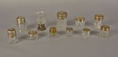 Comprising a Tiffany & Co. jar with engraved and repousse decoration, a Hamilton & Diesinger jar with repousse decoration, a Whiting jar, a Dominick & Haff jar, jar with marks rubbed, an Unger Brothers jar and two small jars marked sterling; together with two unmarked jars. (10).