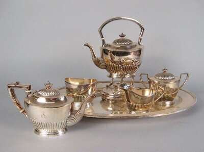Comprising hot water kettle on stand, a teapot, sugar bowl, cream jug, waste bowl and tray, with date marks for 1917. (5).