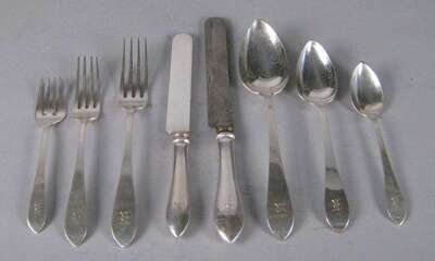 Comprising 6 dinner knives, 6 dinner forks, 6 luncheon knives, 6 luncheon knives, 12 fish forks, 12 teaspoons, 2 serving spoons and 6 dessert spoons; retailed by Bigelow, Kennard & Co. (56).