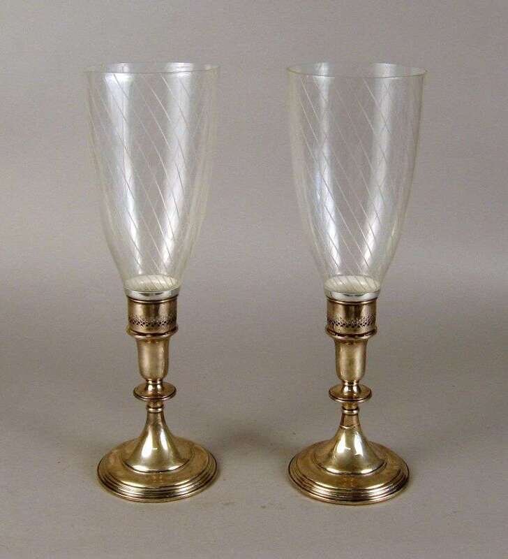 Pair of Redlich & Co. sterling silver candlesticks with hurricane shades american, 1st half 20th century