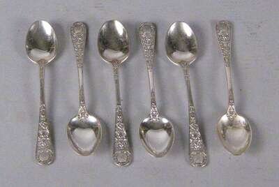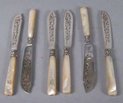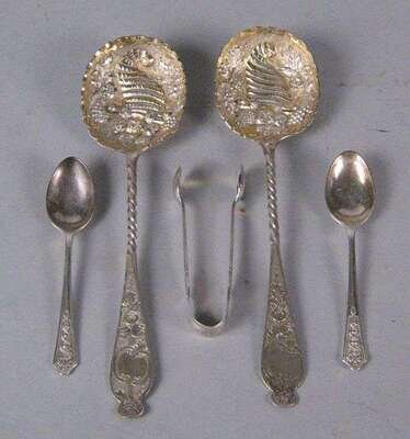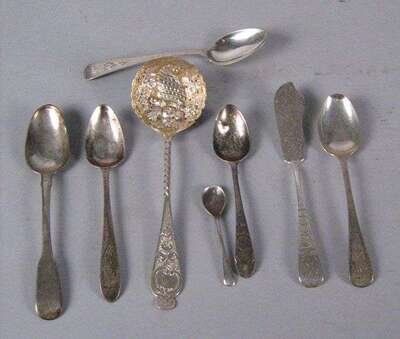 Comprising six George III teaspoons, possibly by Samuel Nelville, Dublin, two dessert spoons and two teaspoons by James Salter, Dublin, 1804, six George III teaspoons, maker's mark rubbed, Dublin, single teaspoon marked 'JS', Dublin, a spoon by Christopher Eades, Dublin, eight teaspoons by Henry Atkin, Sheffield, 1863, six teaspoons by Josiah Williams & Co., London, 1906, 6 teaspoons by Henry Wilkinson & Co., Sheffield, 1875, three gilt washed serving spoons by James Wakely & Frank Clarke Wheeler, London, 1901, two cheese servers, marks rubbed, London, 1901, 6 pearl handled fish knives by Frances Higgins, London, 1859 and a pair of sugar tongs by Charles Wilkes, Birmingham, 1905; together with a toddy ladle, unmarked, 6 silver plate teaspoons, two silver plate sugar tongs, silver plate marrow scoop (60).