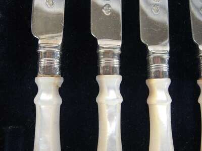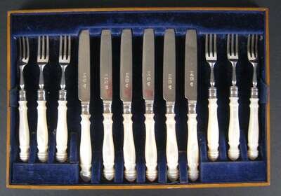 Comprising six forks and six knives each with pearl handles, in a fitted liner. (12).