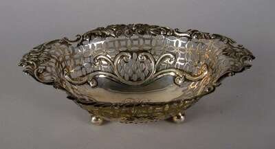 Of oval form with a pierced body and an ornate rim cast with foliate decoration, c-scrolls and masks supported on ball feet.