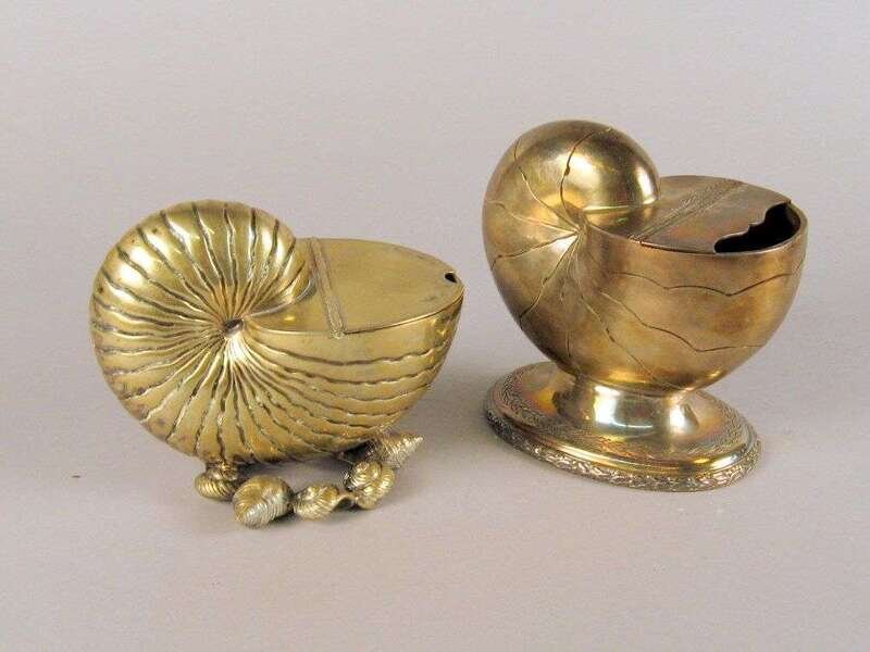 In the form of a nautilus shell, raised on an oval base cast with foliage, together with an unmarked example raised on a foot of cast smaller shells. (2).