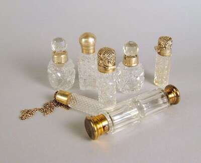 Comprising a bottle by George Henry James, London, 1894, a bottle by Sampson, Mordon & Co., London, 1883, a double sided scent bottle, late 19th century, London, a scent bottle by T.H. Hazelwood & Co., Birmingham, 1902, scent bottle by DJE, Birmingham, 1890, vial by Charles May, Birmingham and another by John Grinsell & Sons, Birmingham, 1890. (7).