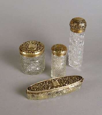 Comprising a powder jar by Mitchell Bosley & Co., Birmingham, a pin box by H. Williamson Ltd., Birmingham and a pair of scent bottles by Henry Perkins & Son, London. (4).