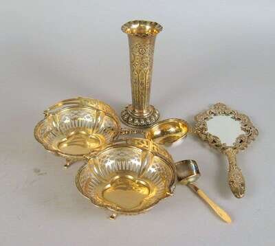 Comprising a pair of Alexander Clark & Co., Birmingham, 1913, swing handled baskets, a repousse hand mirror, London, 1888, maker's marks rubbed, a Henry Atkin, Sheffield, 1890 repousse bud vase, a Hampton Utilities, Birmingham, 1989, tea strainer and a George II sugar scoop, Joseph Wimore, London, 1807. (6).