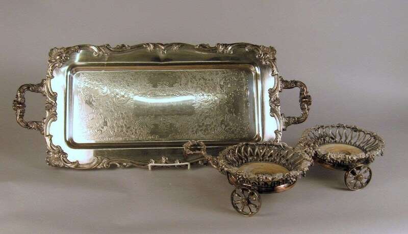 In the form of twin mahogany based trellis baskets on spoked wheels; together with a silver plate dished rectangular tray, with scroll edge. (2).