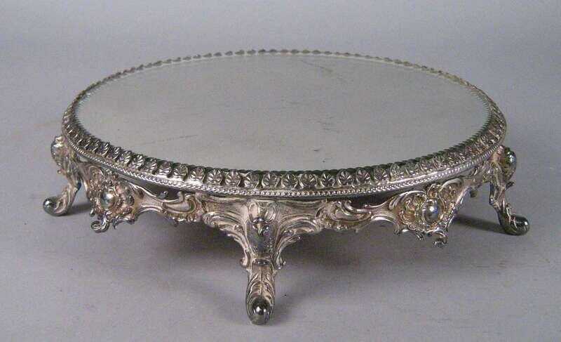 The circular bead etched mirror plate above an ornate scroll cartouche apron, on scroll feet.