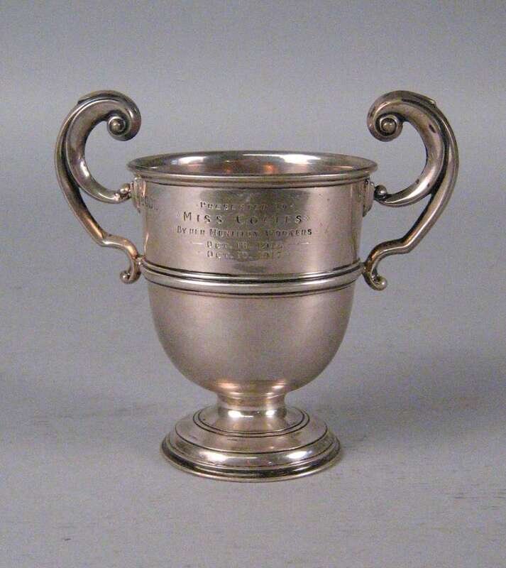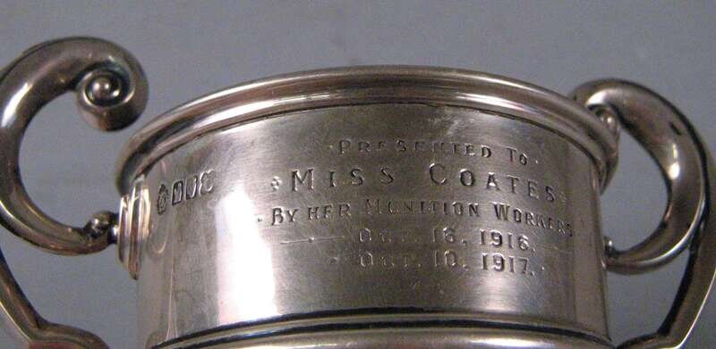 Of trophy form raised on a circular foot, inscribed 'Presented to/ Miss Coates/ By her munition workers/ Oct. 16 1916/ Oct. 10 1917'.