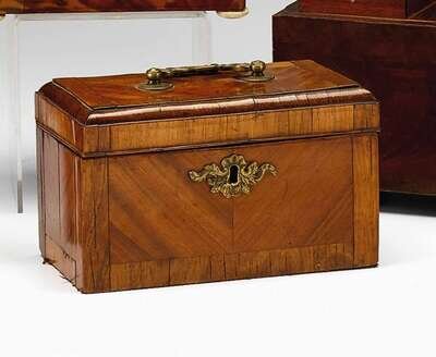 Of rectangular form, the hinged top opening to a lined interior, formerly compartmentalized.