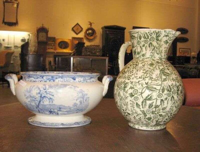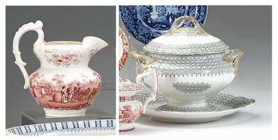 Comprising a blue transferware soup tureen decorated with a family before a river view; a black and white soup tureen, cover and stand decorated in "Plaid and Star" pattern and heightened with gilt; and a red transferware pitcher decorated with a farming scene; together with a large green transferware creamware pitcher decorated with an all over floral motif.