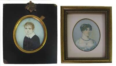 Watercolor on ivory, the first depicting a boy in a dark blue coat and white collar, inscribed on the reverse, 'May 1816 ...4 years 3 months' in a period ebonized frame; the second a young lady in a white gown wearing a bead necklace, in a modern frame, both unsigned. (2).