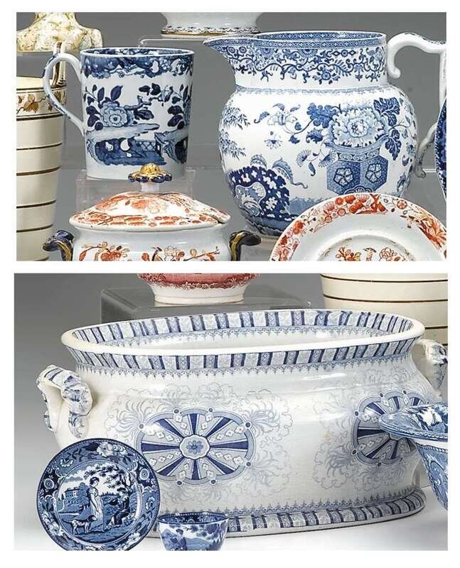 Of oval form with shaped handles and a flaring foot, decorated with pinwheel motif within spearhead and stripe border; together with a blue transferware pitcher and large mug decorated with chinoiserie scenes. (3).