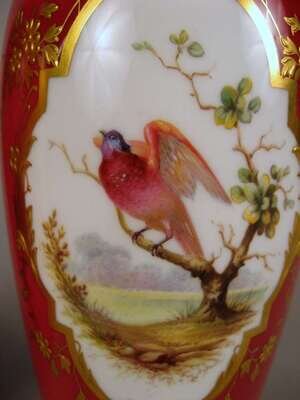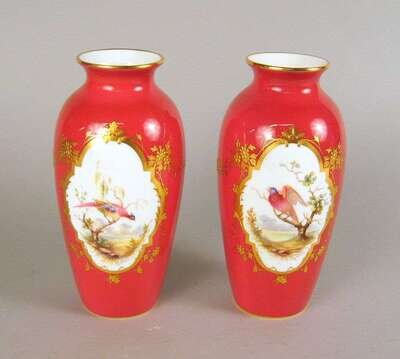 Each of tapered baluster form, the fronts centered by reserves painted with exotic birds, the reverse with similar reserves of garden views, against a deep pink ground, printed gold marks. (2).