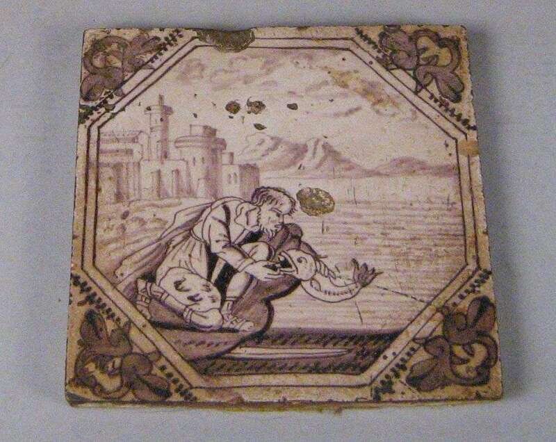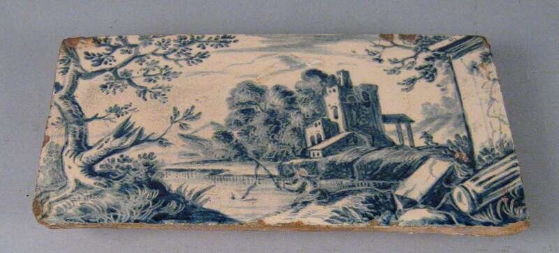 Including a Delft tile depicting a biblical scene in manganese and a rectangular French tile painted with a landscape view. (2).