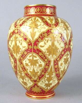 Ovoid form, with raised gilt floral decoration on a pale yellow ground with red banding, painted marks.