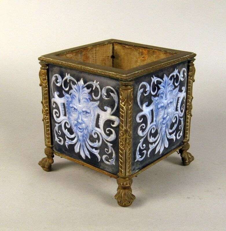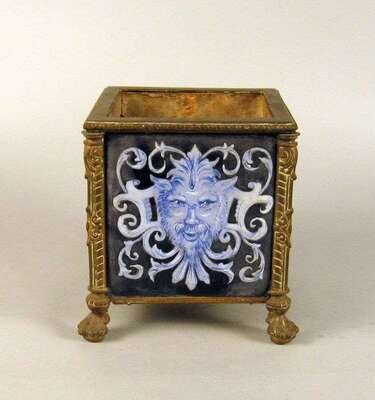 Each tile side depicting a Green man within foliate scrolls, on hairy brass paw feet.