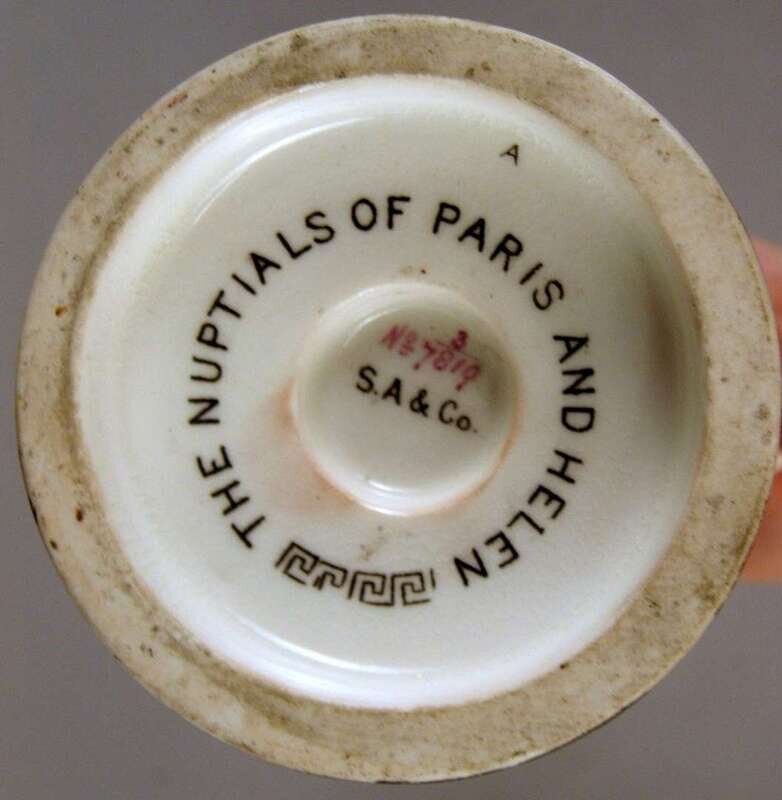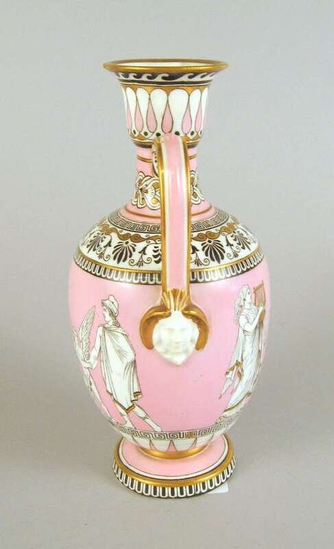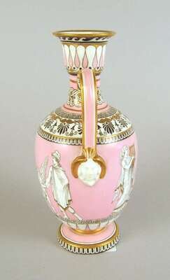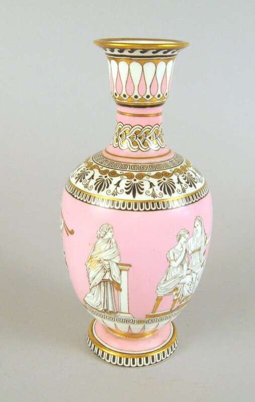 The ovoid body decorated with a continuous band of classical figures on a pink ground with gilt highlights, printed 'The Nuptials of Paris and Helen' and maker's marks to underside.