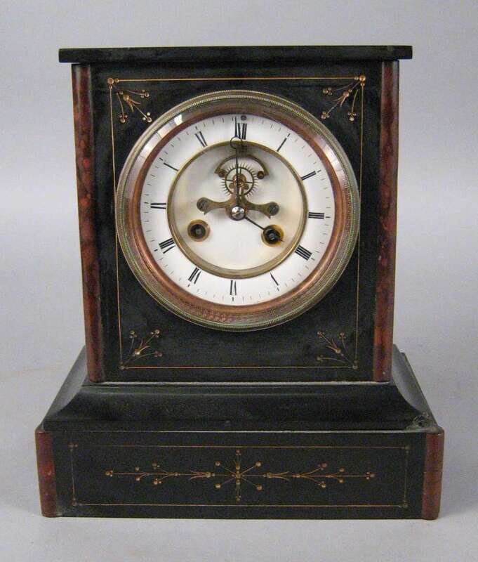 The square case set at the corners with rouge marble 3/4 round columns, on a molded outset base, having a white enamel chapter ring.