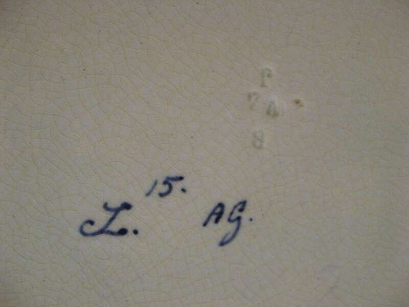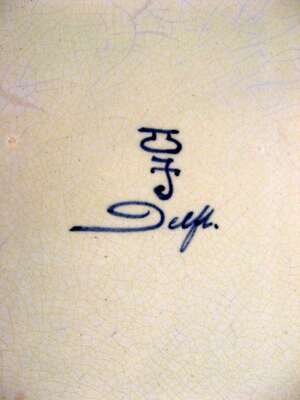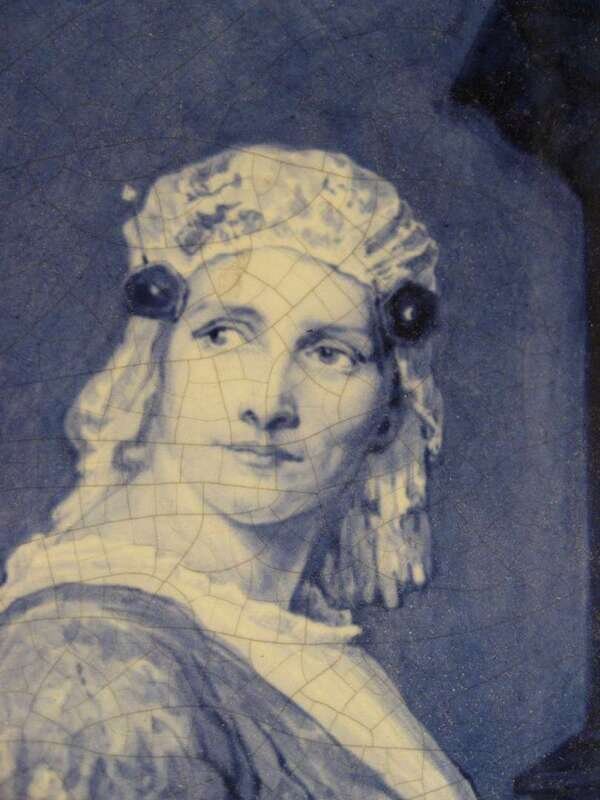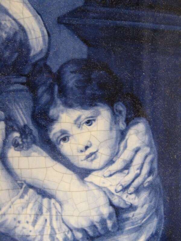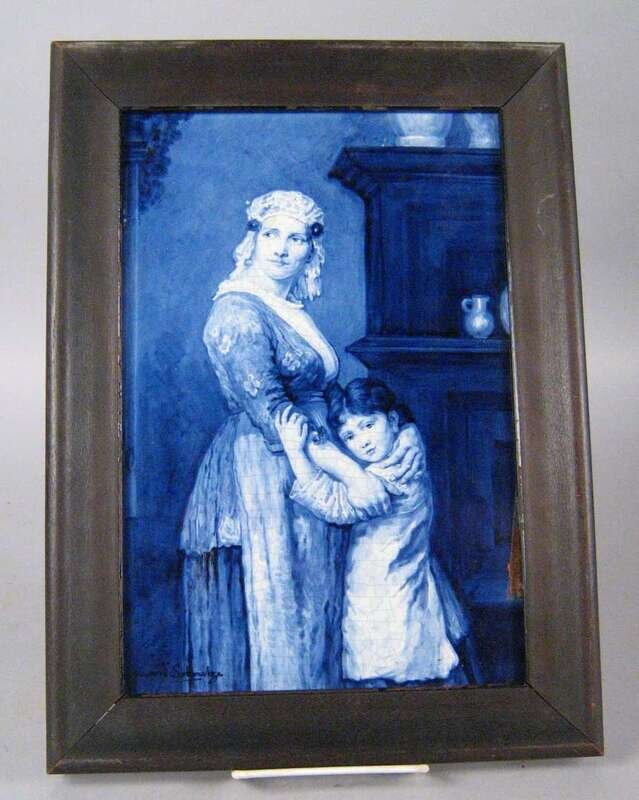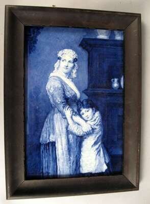 The rectangular plaque painted with a scene of a mother and child; the reverse stamped 'Delft L/ 15/ AG'.