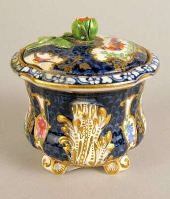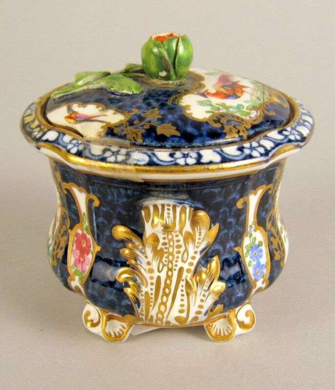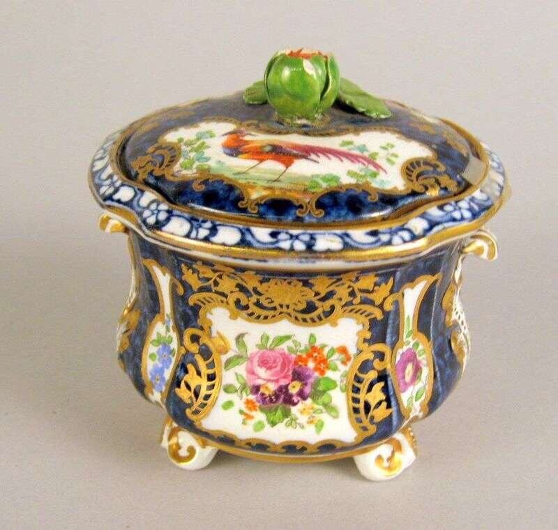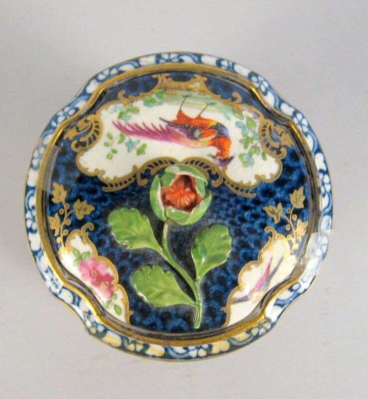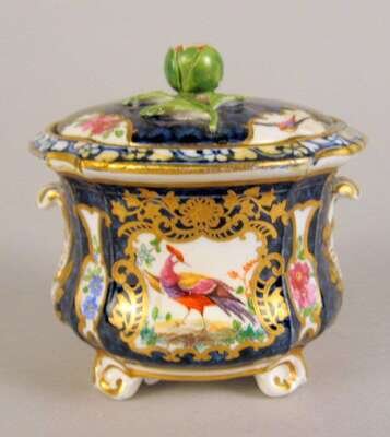 Painted with alternating reserves of birds and flowers outlined with gilt details on a cobalt blue ground, flower bud finial to the top; raised registration numbers to underside.