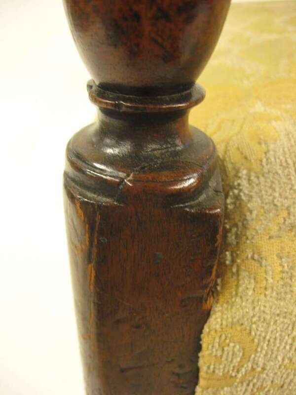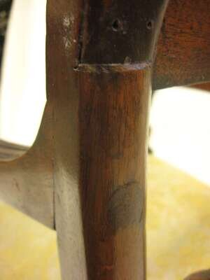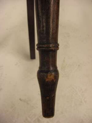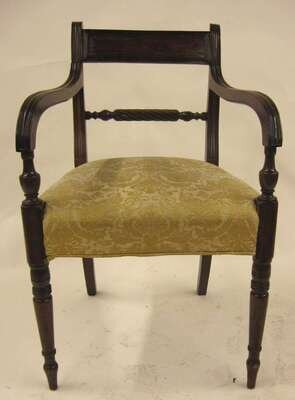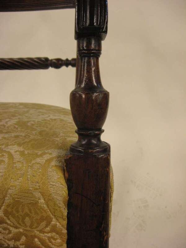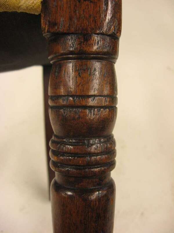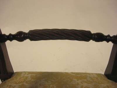 With a curved tablet backrest and rope twist midbar above a padded seat raised on turned tapered legs.
