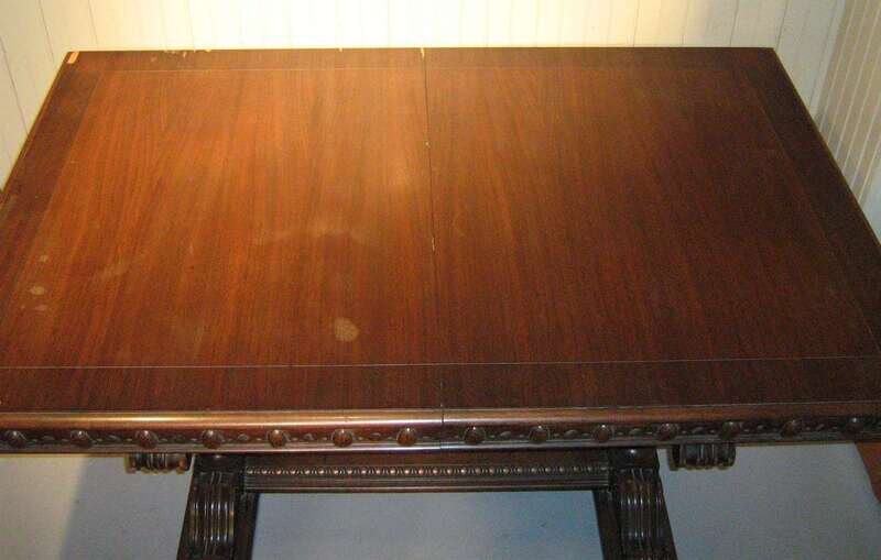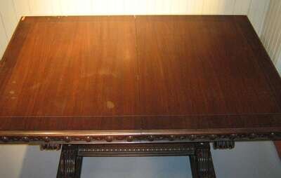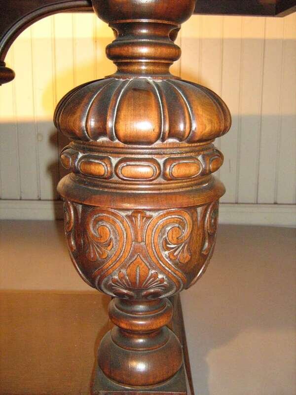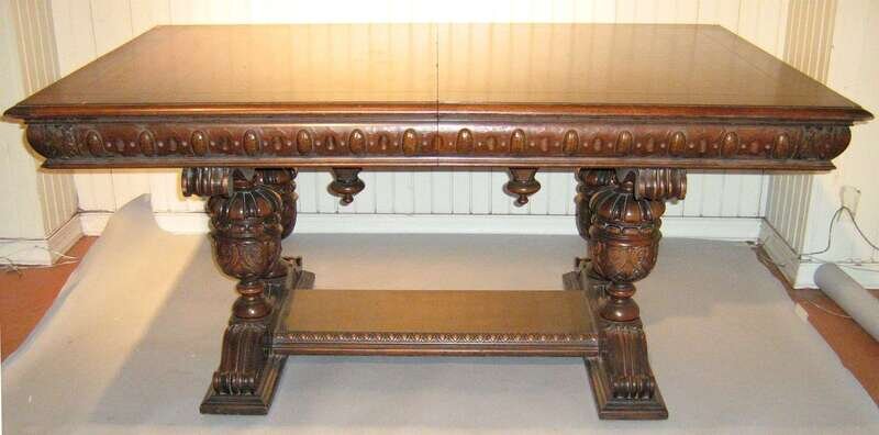 The rectangular top raised on baluster turned trestle supports with a platform stretcher.