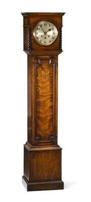The square hood with barley twist columns flanking a circular dial above a paneled door set on a molded rectangular base.