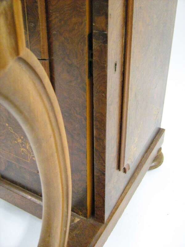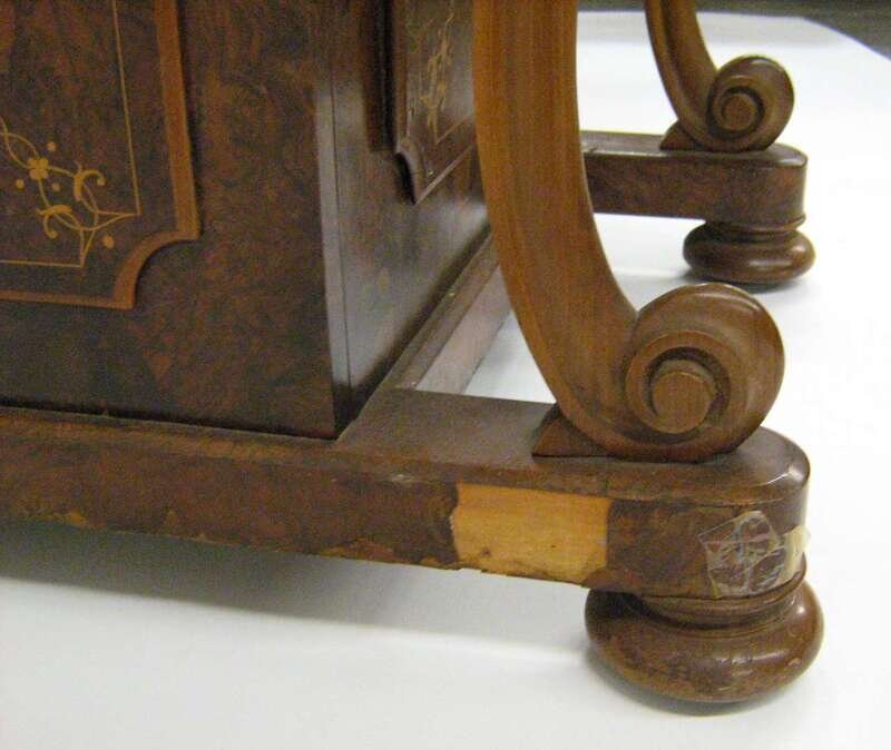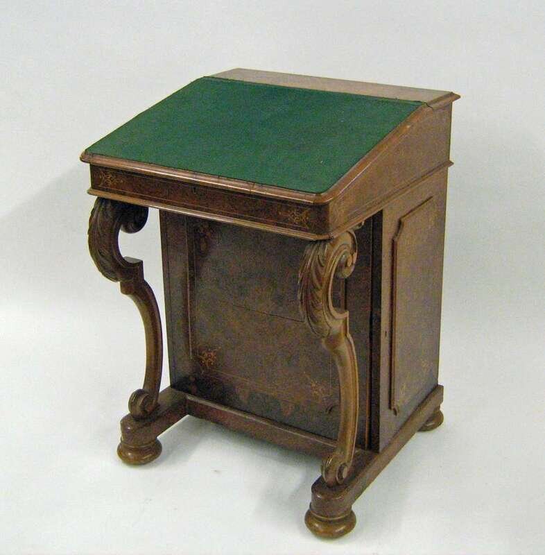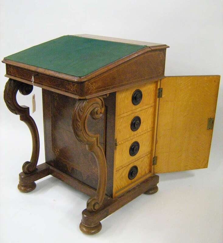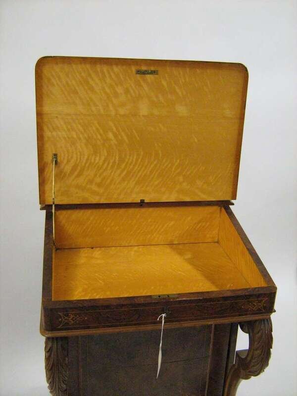the hinged top opening to reveal a veneered tiger maple plain interior with another compartment at the back opening to reveal pigeon holes, supported by carved scrolling supports. A side cabinet door with fitted drawers of tiger maple veneer all resting on bun feet.