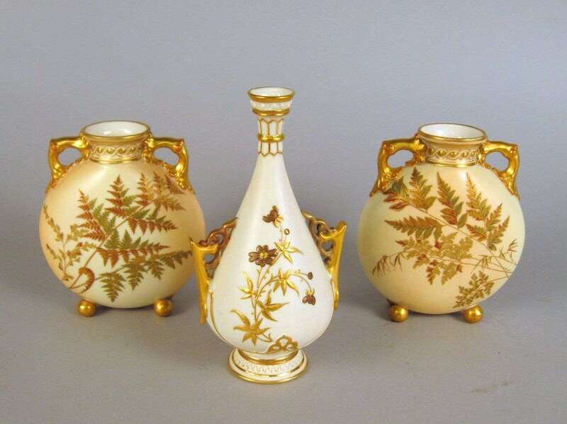 Each of flattened upright circular form with gilded handles and decoration in the Japanese taste, supported on ball feet; together with a Royal Worcester vase decorated with sprigs of daisies and gilt accents. (3).