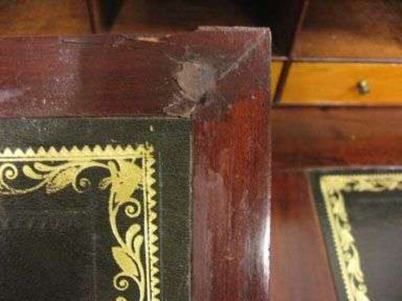 The cylinder top opening to an interior fitted for writing above a slide out drawer above two cupboard doors.