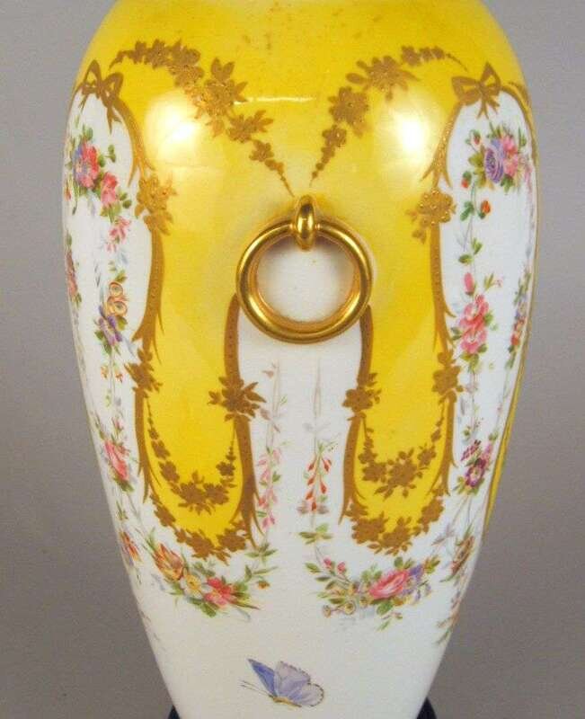 Decorated with trailing flower garlands and gilt accent on a bright yellow and white ground; on an associated wooden stand.