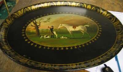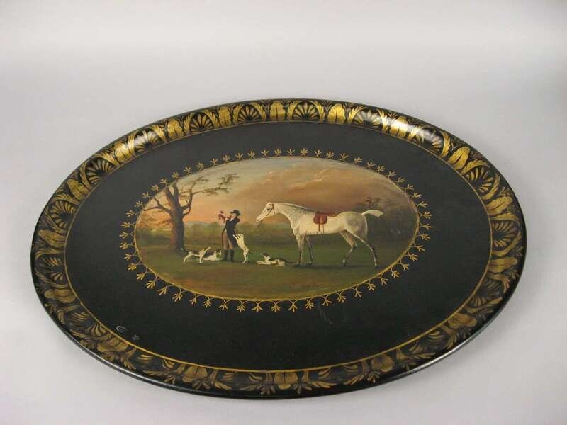Of oval form painted with a hunting scene; mounted on a later japanned stand.
