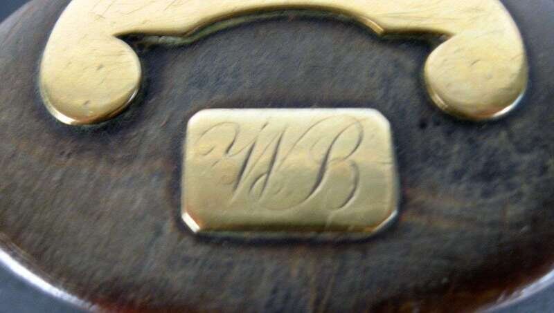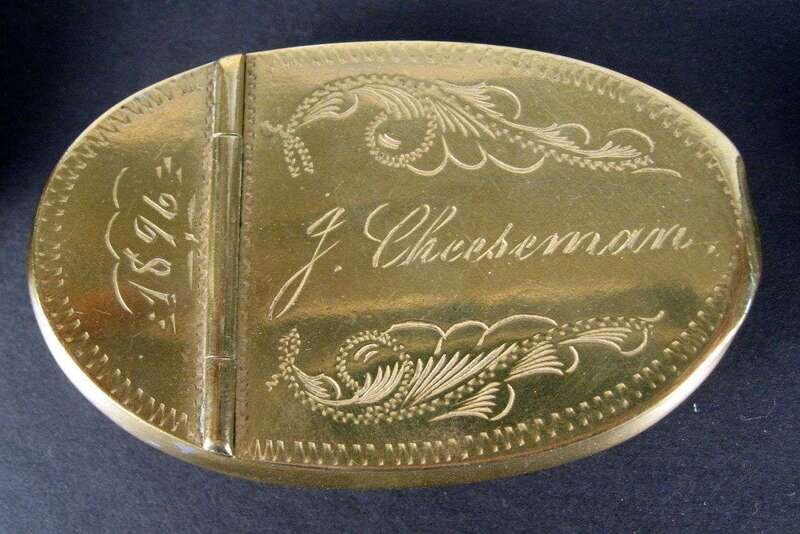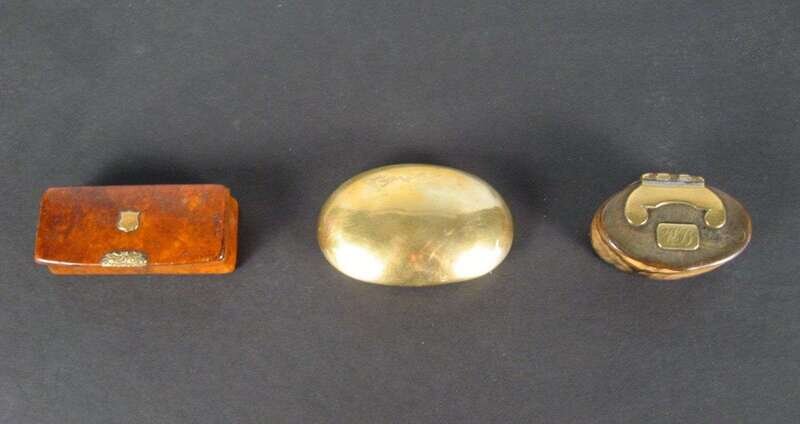Of oval form, the top mounted with a brass plaque initialled, 'WB"; together with a 19th century brass snuff box, dated, ' 1896 J Cheeseman', and a burr wood rectangular snuff box. (3).